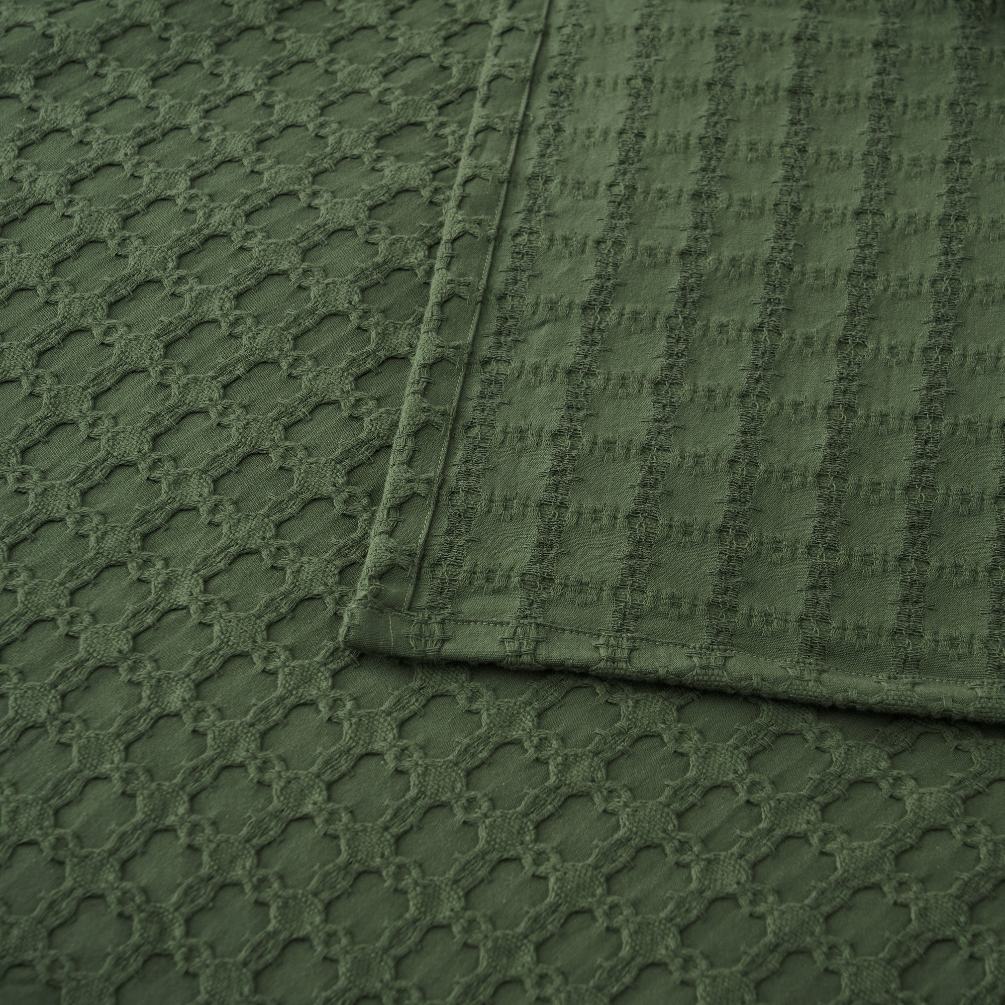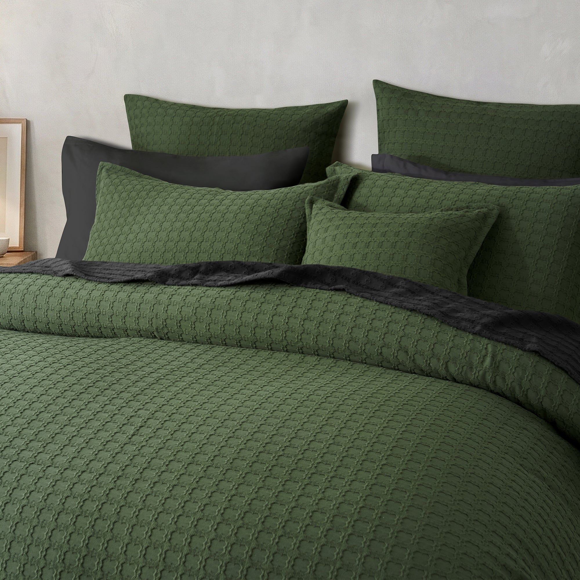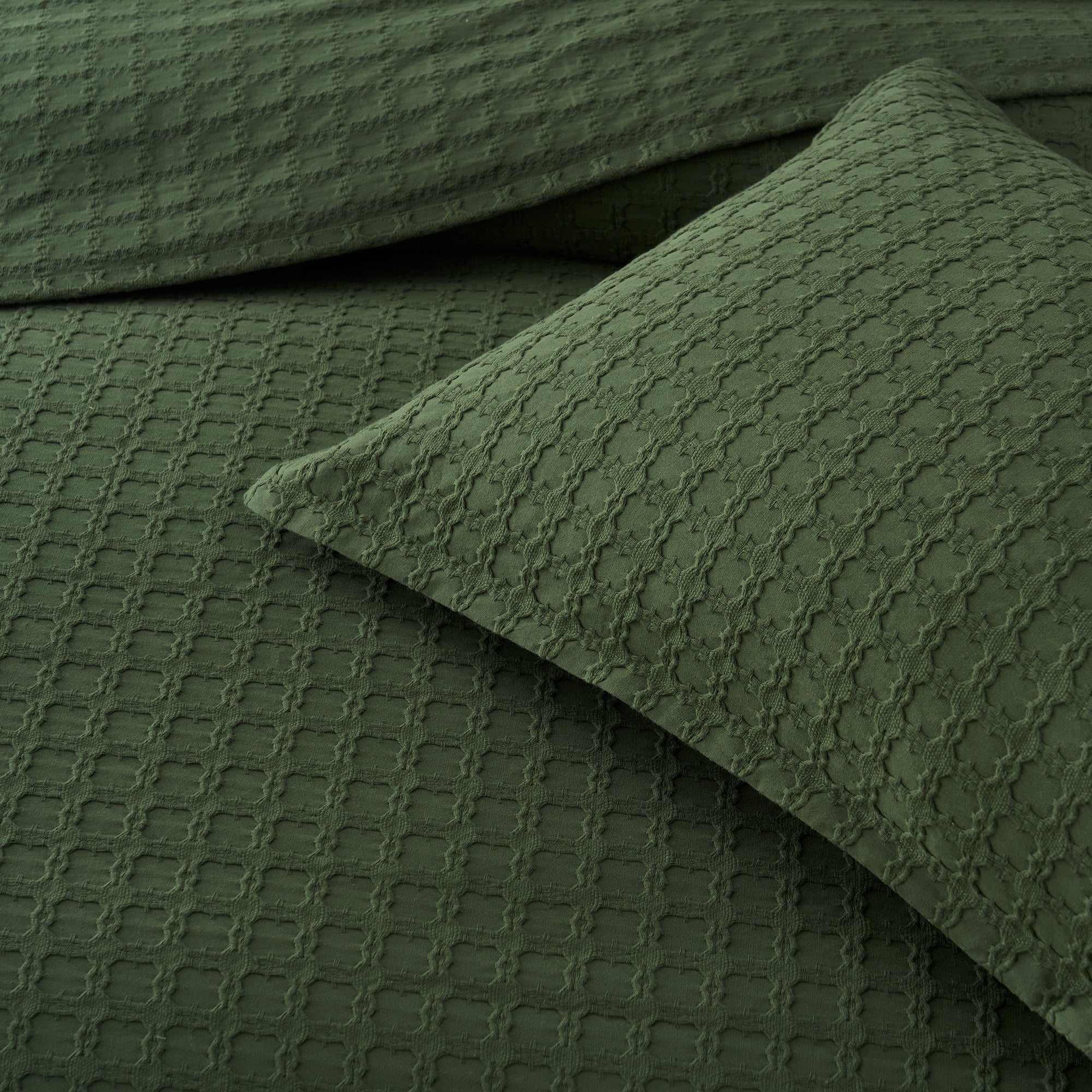This pure cotton bedspread in a rich olive hue features a beautifully risen texture that adds depth and character. Soft to touch, it brings understated elegance and warmth to any bedroom, complemented by standard pillowcases that are finished with a tailored edge for a refined look.