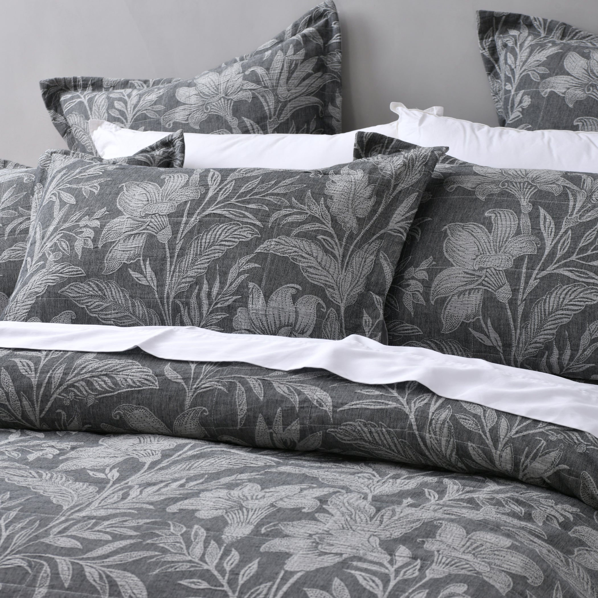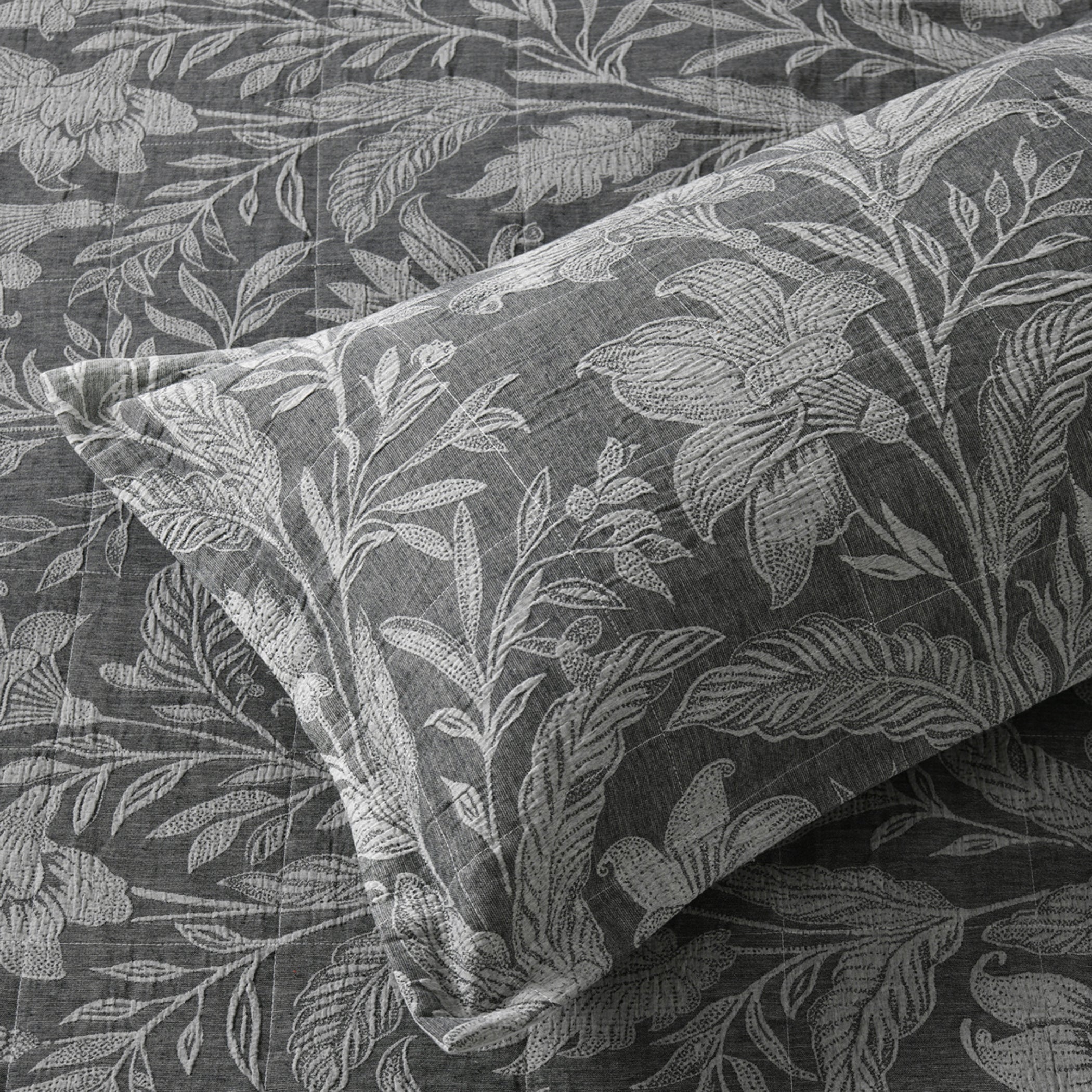 Refined florals with timeless texture. The Maidstone bedspread set features elegant light grey blooms set against a rich dark grey cotton jacquard. Thoughtfully finished with a tailored edge on the standard and European pillowcases, as well as the cushion it brings a polished, luxurious feel to your bedroom.